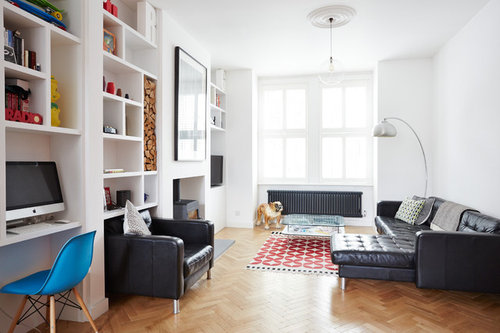 Comments (127)Lots of ideas....couldn't resist adding my two cents. i copied your photos and did a little cut and paste- it's messy, but hopefully gets the main idea across. i'd put your sofa in front of the large book case, chair by the fireplace, tv on the stand on the wall opposite the fireplace - so you can either look at the fire or the tv. Someone suggested using frames of one color for your photos - an inexpensive way to do that would be to spray paint them all a dark color-black goes with everything. Since your shelves are a medium tone wood, display things that are dark or light so that they contrast against the wood. Limiting your display items pallette to a few values usually helps to unify things. (I think that's why so many people want to paint the shelves or put inserts in the back to help your nice things read more clearly...some get lost). If you want to "splurge" -you may consider having a carpenter make a few solid tall cabinet doors to provide a visual break in the shelving. I'm showing 3 doors - 1 on the right side of the fireplace and 2 on the left to leave two open vertical shelves for display on each side - with things arranged to frame the fireplace as the focal point. To add some height to your big vases, consider stacking some books beneath them. Enjoy experimenting untill you get something you're happy with - good luck!...See MoreAdvice for a newbie