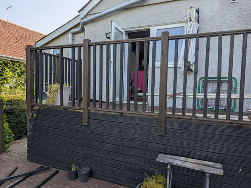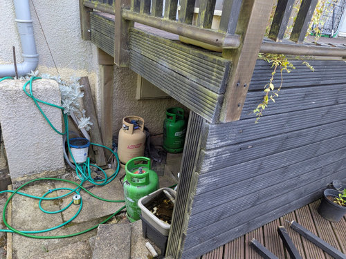My property is a converted bungalow and we have underhouse storage which is also where our large vented cylinder, boiler and electric meter is housed. The door is not full height and it is an awkward step down to get into the space, presumably as the previous owners built a high patio (concrete). We decked the area around 10 years ago and we are now embarking on a new landscaping project to remove all the decking and replace with hardscaping but this are is causing me some difficulty. At present we have a type of balcony area created by the deck which is quite nice to have. The area with the single door is the back door to my mothers annexe, however she rarely uses the area other than to hang washing, so it wouldn't be an issue if we made it a juliette balcony or something else but her door sits directly over the under storage door and so we seem to make it difficult for ourselves to access. I also need to replace the stairs to the right, The window to the aide will be blocked over, so I'm not sure about the design for those either, keep it simple or build something angular. Any suggestions, especially regarding the under house storage access and the door above it would be gratefully received!