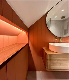 Loft bathrooms can be a challenge, especially when you have to handle a sloping roof. You can see some good tricks in one of our recent bathroom renovation projects: Lit storage in the eaves, a custom mirror cut to fit the space and clear shower panels keeping the room bright with a spa-like feel.