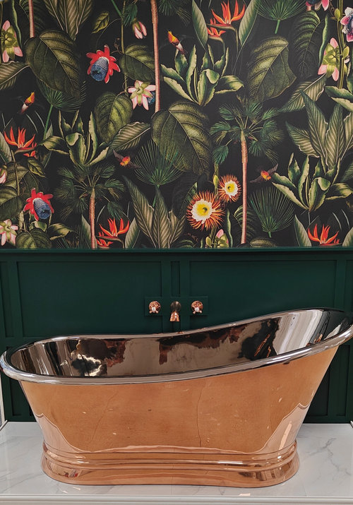 Graham and Brow wall paper with BC Designs copper and nickel bath inc copper taps