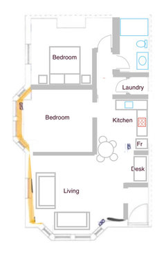 Pictures of current floor plan, my poorly drawn up floor plan idea, and some pics of the bay windows in the kitchen.