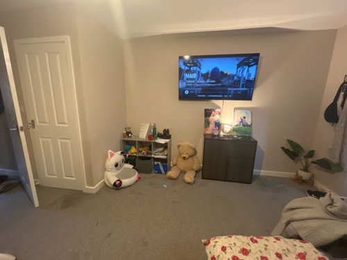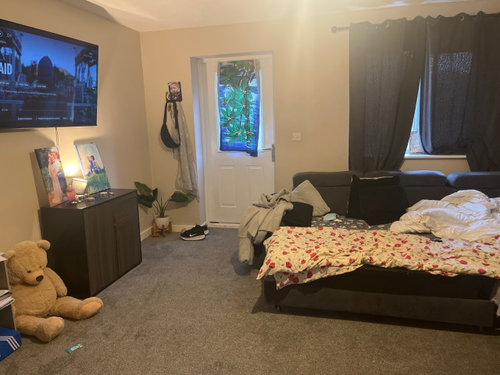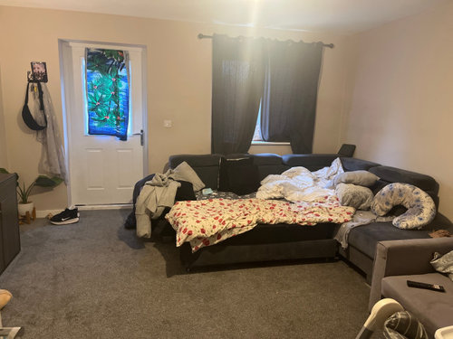 Storage space is limited. The small carpeted room may make fitting a dining table challenging, though a foldaway table could work if there’s enough room. The existing sofa is quite wide—if you plan to replace it, compare sofa depths carefully, as many models are deeper than they look. Choosing a narrower yet comfortable sofa could free up valuable space. A long sideboard would be useful for storing dining and family items. To finish the look, add a few side lamps to define the area and, if space allows, a small rug beneath the dining table.