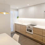 Cocina lineal con isla cuadrada de zona de lavado.