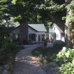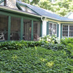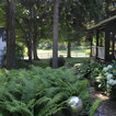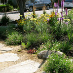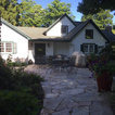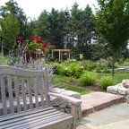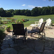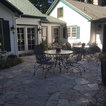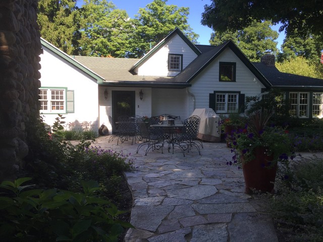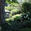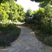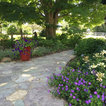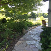 A Chilton flagstone walkway is surrounding by hydrangeas and rozanne geraniums.
