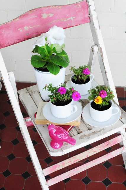 Plant a teacup garden. Put old, chipped teacups to new use by transforming them into mini planters. Before planting, you’ll need to drill a drainage hole in the bottom of each cup. Use the saucer to protect your table from water. Planted with pansies or other small flowers, these teacups would look sweet grouped on the dining table or just about anywhere. Tip: Stock up on single teacups at yard sales, flea markets or thrift stores and plant them to give as hostess gifts all season long.