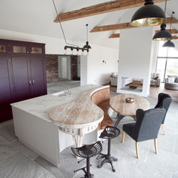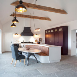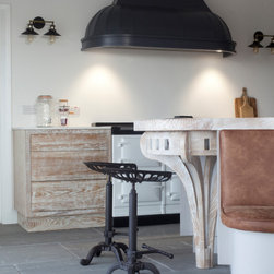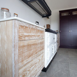 For crockery and cutlery, handleless slab drawer packs in distressed whitewashed oak bring warmth and texture, topped with a thin white stone for a clean, polished surface. A bespoke, ornate hood painted in midnight black hovers above the range, adding to the agrestic charm of the space.