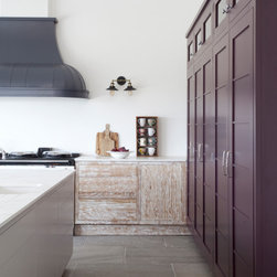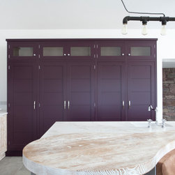 A bank of Shaker cabinets in luscious mulled-wine houses fridge, freezer, and pantry storage, artfully contrasted by high-shine chrome handles, knobs, and exposed butt hinges. Traditional glazed uppers add a classic touch, crowned with crisp, modern square cornicing to balance the look.