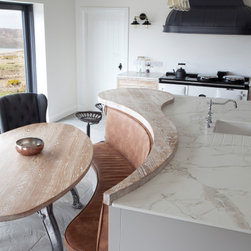 The large island offers ample prep and cleaning space, featuring push-to-open slab drawers and doors in sleek matte white. A fully integrated dishwasher sits near the undermounted sink, complete with an ornate mixer tap and stone-cut drain grooves for both elegance and practicality. The teardrop breakfast bar with an ornamental corbel leg and the elliptical dining table, are also crafted from the same whitewashed solid oak, create a warm invitation to gather. Paired with soft leather curved bench seating, this dining space offers a lavish, comfortable spot to enjoy meals while taking in views of the wild Atlantic coast.
