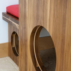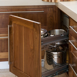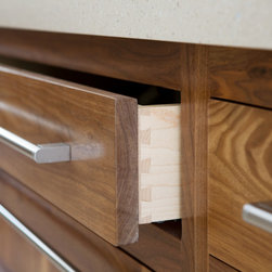 Cabinet doors are tongue-and-groove joined, fastened by exposed butt hinges. Drawers are dovetailed in construction and soft-close. Both are fitted with polished, stainless-steel handles. The cornicing along the top of the cabinets is also made of solid Walnut, and the toe-kick is stainless steel as well.