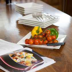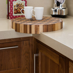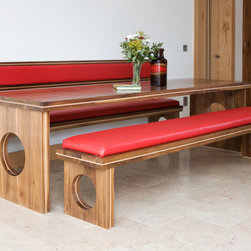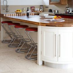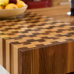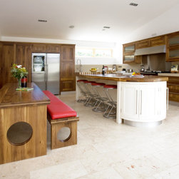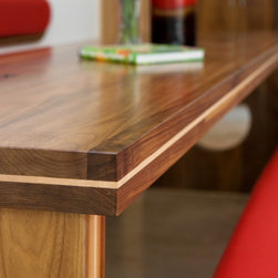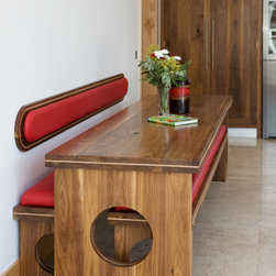 The island features custom-curved painted cabinets, and both the countertop and custom dining room table and benches are made from solid Walnut with a Maple Inlay. Butcherblock cutting boards and decorative elements are made from the same material combination.