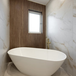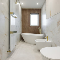 This bathroom was created by combining two rooms into one, with the main challenge being a very long and narrow layout while still accommodating a freestanding bath, walk-in shower with bench, toilet, and double vanity. The design focused on careful space planning and bespoke solutions, allowing everything to fit comfortably without compromising flow or functionality.