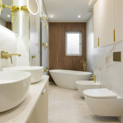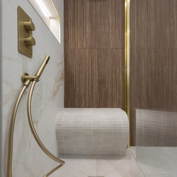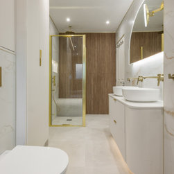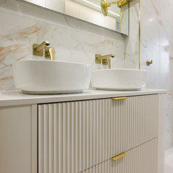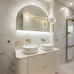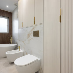 A combination of three tile finishes was used to create depth and warmth—a soft concrete-effect floor, marble-effect wall tiles, and wood-effect tiles at each end to introduce a natural, grounding element. All cabinetry, including the double vanity, was custom-made to maximise storage and maintain a clean, cohesive look.