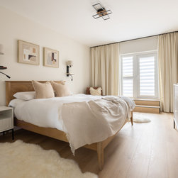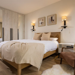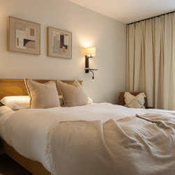 This bedroom blends warm neutral tones with natural wood accents, creating a calm and inviting atmosphere. The clean lines and minimalist design keep the space feeling modern, while layered fabrics and soft textures add a sense of coziness. Contemporary wall sconces provide ambient lighting, enhancing the room’s elegant simplicity. A perfect balance of comfort and style, it feels both sophisticated and relaxing.