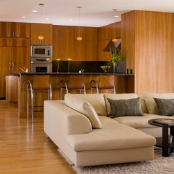 The second structure is the living room pavilion. Filled with natural light, this is the most formal and ceremonial area of the three and is set apart and rotated slightly from the other two, aligning the aspect with Mount Tamalpais as a way to convey its ceremonial role in the homeowner's life. The final structure, which is by far the largest, contains all the rooms and spaces required for every day living, and has a strong connection to the terraces and views.