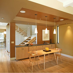 The house borrows from various sources while providing a family with an inspiring and comfortable setting that reconnects their daily life to the landscape. The house is tall and narrow with 3 major levels and 3 minor levels for a total of 6 levels within the house.