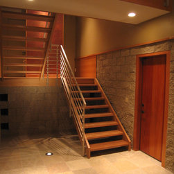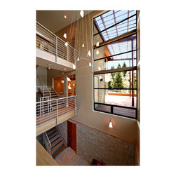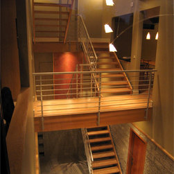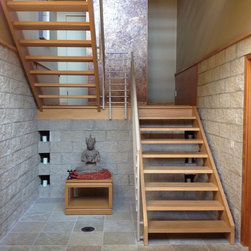 Entry into the house is found under a low cantilevered deck and into the entry hall which suddenly explodes upward 30 feet, animated by two stacked bridges. This hall is lit from above by high windows and made cool by split-face concrete block walls and floor tile. As one ascends the stairs, the materials change from heavy masonry to wood to symbolize the movement from earth to light through the senses: by air temperature, by movement, by different views, and by different lighting.