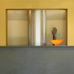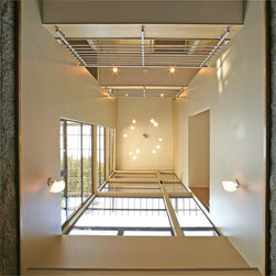 At the very top of the stair well, the master bathroom tub-room opens into the stair well with sliding translucent screens, reminiscent of Japanese shoji screens, that can be open or closed, depending on the owner’s wishes and their thermal needs. A large skylight back-lights the screen to bring an additional and unexpected source of daylight into the space.