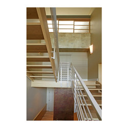 As one ascends the stair from the dark coolness of the entry hall to the light, or crosses over the two bridges , the house interiors and exteriors are experienced from different viewpoints---The passage up, down and through the space is exciting and dynamic.