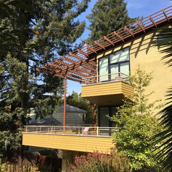 Outside, the roof de-materializes into its basic structural components for architectural and “green” purposes. The roof is solid where needed but opens up to reveal the structural framing to form a trellis that creates a sense of enclosure over the cantilevered deck in comparable. This expressed structure, constructed in-expensive pressure-treated low-grade lumber, is assembled with great care reminiscent of Japanese wood-working. The extra-tall slender steel pipe columns, reminiscent of early 20th century modern architecture, are expressed as architectural tree trunks supporting a high trellis structure that suggests a rain-forest tree canopy and suggests a connection with the large Redwood on a few feet away.