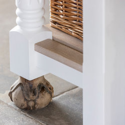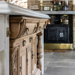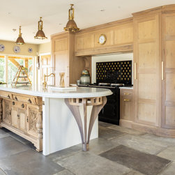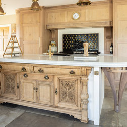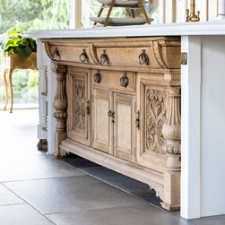 At the centre, the custom island distinguishes the kitchen as one of a kind. An antique unit is seamlessly scribed into the cabinetry, complete with slatted shelving for wicker baskets on one side, while the other extends into a seating area supported by a carved solid wood pedestal beneath a 60mm quartz worktop with a double ogee profile. Further details—tongue-and-groove panelling, fluted pilasters, carved ball-and-claw feet, and animal motif onlays—enrich the piece with heritage artistry.