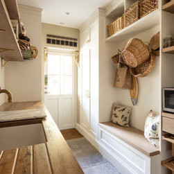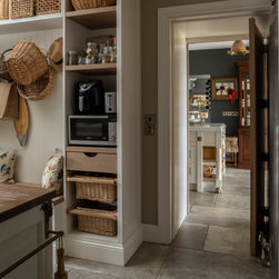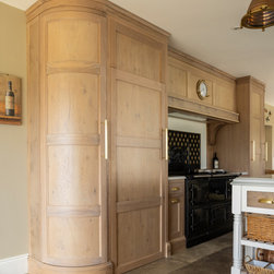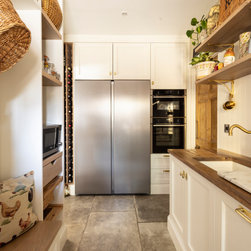 The cooking area is framed by a bespoke handmade hood and sweeping curved tall units with discreet spice pullouts, while opposite, the island holds a traditional ceramic Belfast double sink. A concealed cabinet doorway leads into the walk-in pantry and scullery, housing an additional ceramic sink set underneath a 40mm solid oak worktop, alongside a full-height Liebherr Fridge/Freezer and eye-level Neff oven and combi oven. This hidden space also features a floor-to-ceiling wine rack, wicker basket pullouts, and a custom bench seat for practicality and charm.