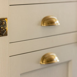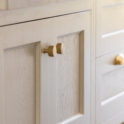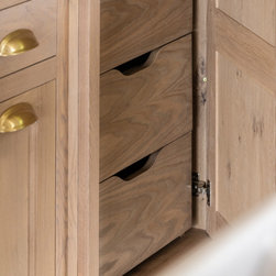 A delicate blend of classical revival and modern hardware, this oak and white kitchen is complete with a hidden pantry and a statement island. With brushed brass embellishments and ornate period detailing, master craftsmanship delivers a space fit for royalty.