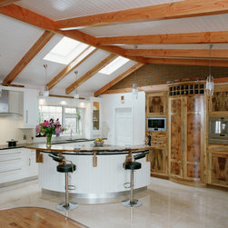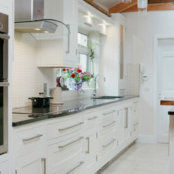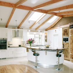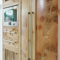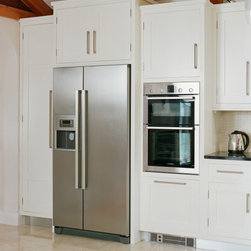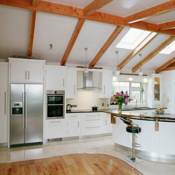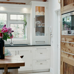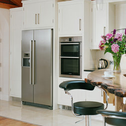 In-frame shaker cabinetry painted in crisp white is balanced by a bank of tall units crafted from solid native elm, their natural grain adding warmth and depth. A thick black granite worktop with a bevelled edge offers striking contrast to the white cabinets, softened by a cream tile backsplash that lends light and warmth. From the angular handles to the plinth, every hardware and appliance detail is unified through a matching stainless-steel finish, giving the kitchen a subtle contemporary energy.