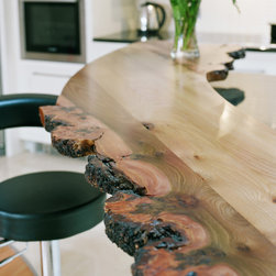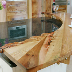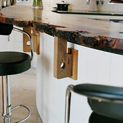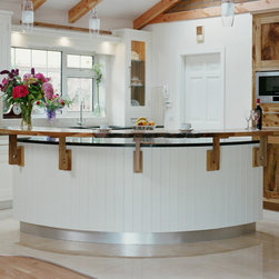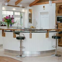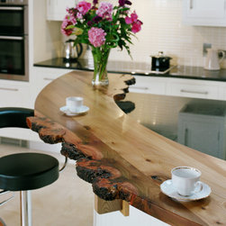 Character and craftsmanship are expressed through an array of bespoke touches: traditional tongue-and-groove panelling, an arched wooden valance framing the sink, and a floating cornice accent found above key areas throughout the space. The live-edge breakfast bar which arcs around the island is a favourite detail of ours, a tactile bridge between modern refinement and organic beauty.