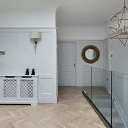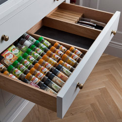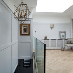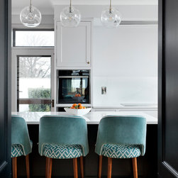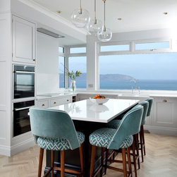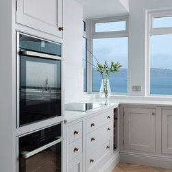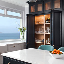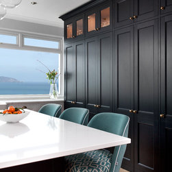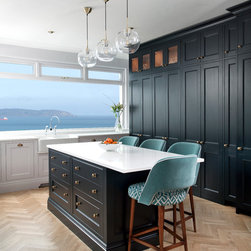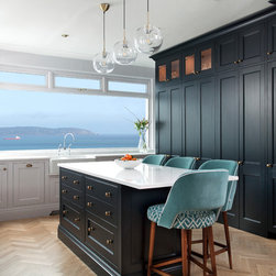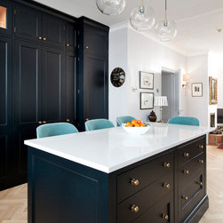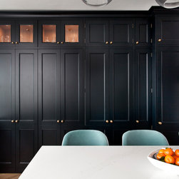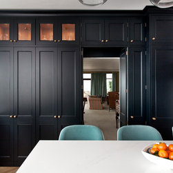 This classic shaker style, walk through kitchen was painted in Farrow and Ball's Black Blue paint.