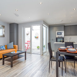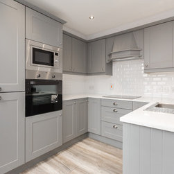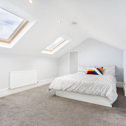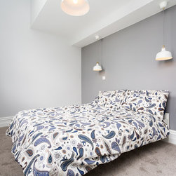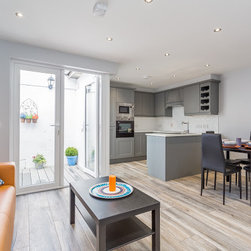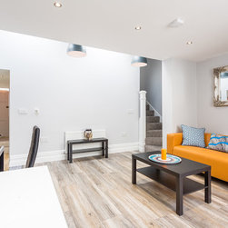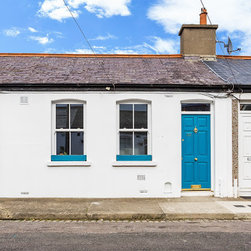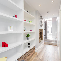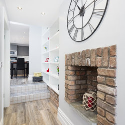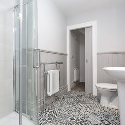 Small traditional bathroom with pocket door to access laundry store under stairs