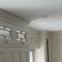 Painted in a silky heritage white, the beaded in-frame cabinetry is designed with classic shaker doors and finished with chrome exposed butt hinges and knobs. Thoughtfully hidden storage, including a bi-fold breakfast station, keeps surfaces clear while supporting daily life with ease and elegance. Cabinets and units have been arranged in a pleasing symmetrical layout, with mirrored glazed uppers cut into geometrically interest shapes for architectural interest.