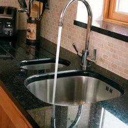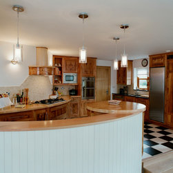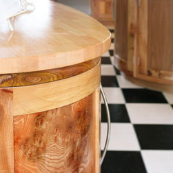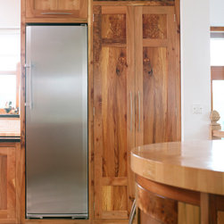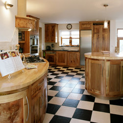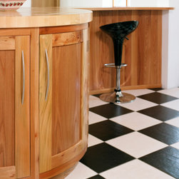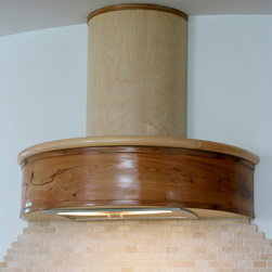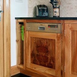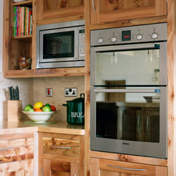 Cabinetry intelligently follows the irregular contours of the room, with the kitchen separating the main modes of function: Food storage, cooking and clean/prep into distinct separate zones, with the all-important working triangle between. A peninsula breakfast bar sweeps between the kitchen and the lower-level living area. In this way, the kitchen sweeps and curves much like the flowing grain of the Irish Elm its built from.