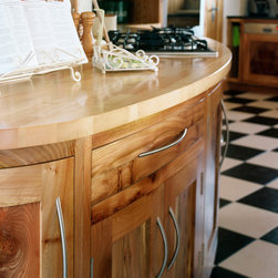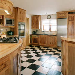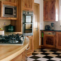 Classic in-frame shaker cabinetry is crafted from beautiful Irish Elm, with curved cabinets, square cornicing and tongue & groove panelling. The warmth and wildness of the Elm’s character is contrasted with machined stainless-steel finishes of the appliances, sleek handles and exposed butt hinges. Oak butcherblock and solid black granite makes up worktops along with a cream tile backsplash.
