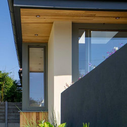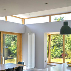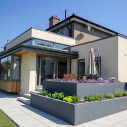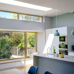 Contemporary Family Home with Abundant Natural Light — A considered side and rear extension reconfigures the ground floor, establishing a generous open-plan kitchen and dining area that connects fluidly to a newly formed living space. To the rear, a raised patio integrates layered, terraced planting that transitions down into a sunlit, south-facing garden, enhancing the connection between interior and landscape. A cantilevered timber-clad window seat introduces tactile materiality, offering both texture and a moment of quiet within the extension. The kitchen is defined by an increased ceiling height and a continuous band of clerestory glazing, bringing diffuse natural light deep into the plan and reinforcing the airy, expansive quality of the space.