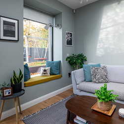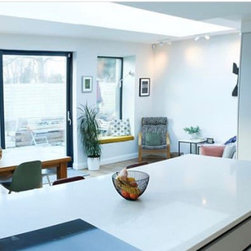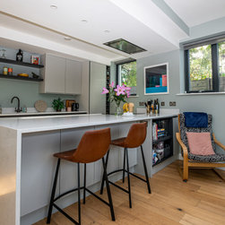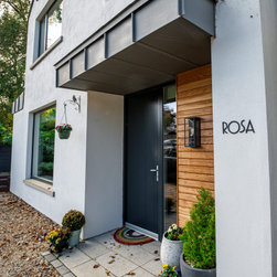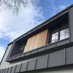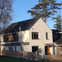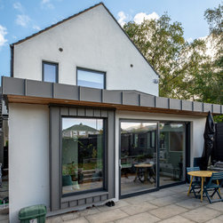 This newly built, bespoke three-storey, three-bedroom home is situated on the original family home site, adjacent to the existing residence. Featuring a modern design with a gable-fronted façade, the exterior combines timber and zinc elements to highlight key architectural features, offering a deliberate contrast to the clean, crisp render that defines the primary massing.