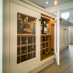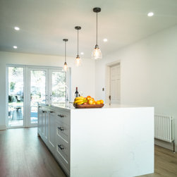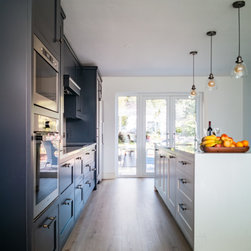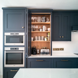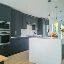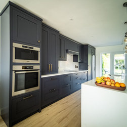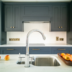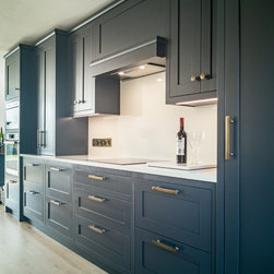 Conceived in a contemporary inframe shaker style, the cabinetry pairs deep navy blue with brilliant white for a striking, timeless contrast. Brushed black brass handles, knobs, and fixtures add a warm, tactile accent and subtle richness. Crisp white quartz worktops rise seamlessly into a full-height backsplash, cascade in a waterfall over the island, and extend outward into a breakfast bar for three.