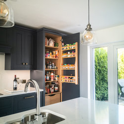 Running neatly along one wall, the design begins with a conveniently positioned oven and microwave at eye level, followed by a concealed breakfast station dresser for a clean, uncluttered kitchen. Beneath the hob, extra-deep drawers provide effortless access to cookware and crockery, balanced opposite the island’s undermounted sink, which is flanked by discreet pull-out bins and an integrated dishwasher. At the far end, an extra-tall pantry and a statement USA-style fridge/freezer complete the arrangement, condensing all cooking needs into one short run.