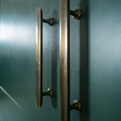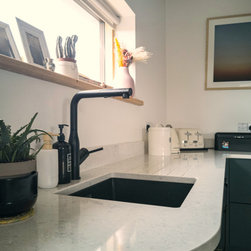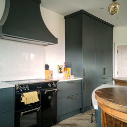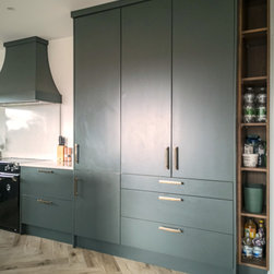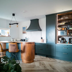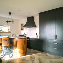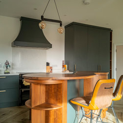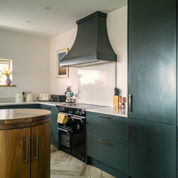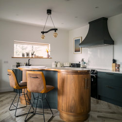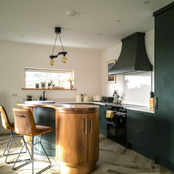 This contemporary lay-on slab kitchen is finished in a soothing palette of forest green and warm oak cabinetry, complemented by weathered brass handles and a white quartz worktop, upstand, and backsplash. The natural tones and tactile finishes strike a balance between contemporary design and inviting warmth, resulting in a space that feels grounded yet sophisticated.