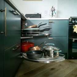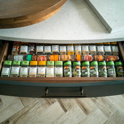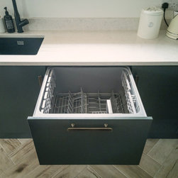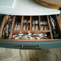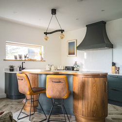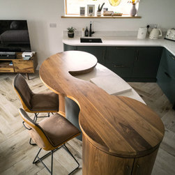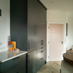 The open-plan L-shaped layout orbits around a uniquely curved island, designed to facilitate easy movement between cooking zones and the adjoining living area. An undermounted granite sink with a black stainless-steel tap anchors the main prep area, paired with integrated pullout bins and twin Fisher & Paykel dishwasher drawers for effortless cleanup. The range cooker and its curved canopy hood form the kitchen’s visual centrepiece, flanked by deep drawers for cookware and crockery, facing opposite spice and cutlery drawers with oak inserts for refined functionality. The 70/30 fridge-freezer and pocket-door breakfast station are strategically placed at the kitchen’s outer edge, ensuring accessibility while maintaining a clean, uncluttered appearance.