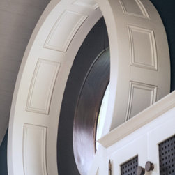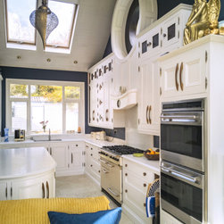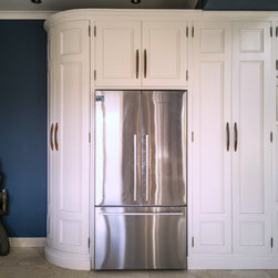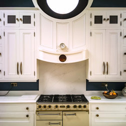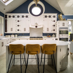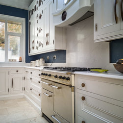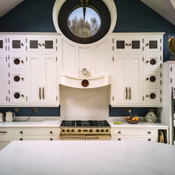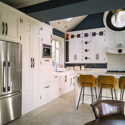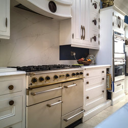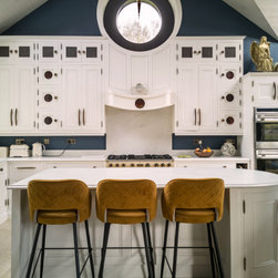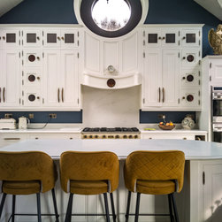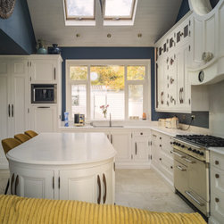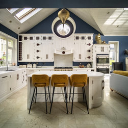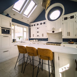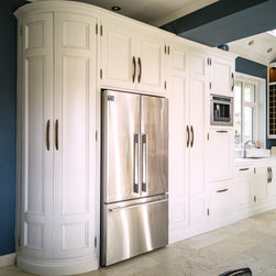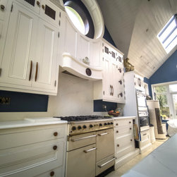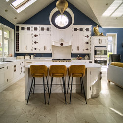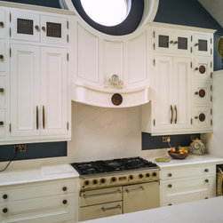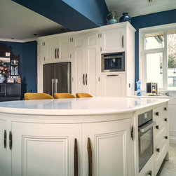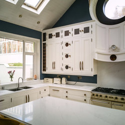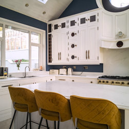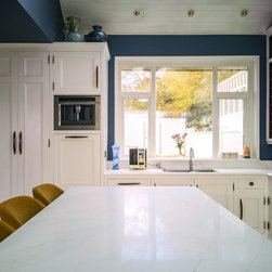 Distinctly tall in-frame cabinetry is painted off-white, housing beaded-shaker doors hung by ornate butt-hinges in antique brass, and opened by handmade wenge handles and knobs. Brilliant white quartz, finished with an ogee bullnose edge, crowns the worktops, and pushes up into both an upstand and backsplash for a cool, solid touch. Decorative touches, including cornicing, plinth skirting, light rail moulding, and tongue-and-groove panelling, create a harmonious blend of tradition and luxury.