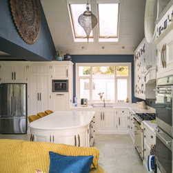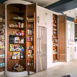 Moving clockwise, the L-shaped layout assembles kitchen functionality into 3 key areas. Along the left wall, food storage is organized between the curved double door larder, massive freestanding fridge/freezer and the floor-to-ceiling spice racking. Beyond, the raised dishwasher, extra-deep pullout bins and the submerged double sink consolidate cleaning into one tight footprint. The gable wall is brimming with storage for cutlery, crockery and keepsakes alike, with cooking powered by the central cream range, extra-wide eye-level oven and matching combi. The island sports its own undercounter oven, as well as providing a large space for food prep, homework and parties alike. Thusly, the kitchen is arranged to minimize footwork for quick, efficient and easy cooking.