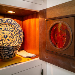As can be expected, the kitchen is filled with the delightful and luxurious detail. Wall cabinet doors feature wenge lattice centre panelling, as well as fused and kiln-formed glass windows, both of which glow with interior cabinet lighting. Cabinet interiors are built with sapele dovetail drawers, shelves, and solid wood inserts. The star of the kitchen, however, is undeniably the cooker canopy which rises and flowers into a curved, beaded-shaker surround for the gable wall’s circular window, with the canopy’s mantlepiece arched to match, demonstrating the creativity and meticulousness of its maker.