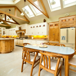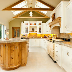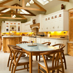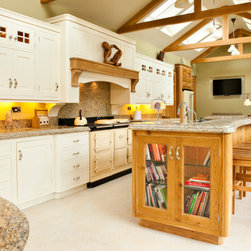 The rich character oak, used throughout the island, cornices, and custom-built range hood, matches with trusses and doorways—to be harmonious with the home. Contrasting this is a crisp painted finish in soft white, evoking a sense of cleanliness and contemporary freshness. A gently speckled cream stone worktop and matching backsplash—with a finely sculpted triple-pencil edge—unites both finishes with understated elegance. Warm golden under-cabinet lighting enhances these natural textures and tones throughout, and appliances are finished in a matching glossy cream.