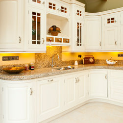 To the highest standard of cabinetry craftsmanship, the kitchen features beaded in-frame cabinetry with raised-panel doors and drawers, fitted with exposed butt hinges and equipped with pewter and stone knobs and handles to match the worktops. Cabinets are lush with decorative detail, such as the solid-wood curved cornice and pelmet, which both feature decorative oak inlay, as well as the grand, solid wood hood and oak mantle above the range. Wall units are crowned with a row of ultra-traditional glass front-uppers, echoing historic English kitchens. The oak island is made up of curved cabinets and panelling, and features an additional undermounted sink, breakfast bar and easy-access bookshelf.
