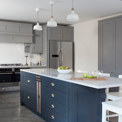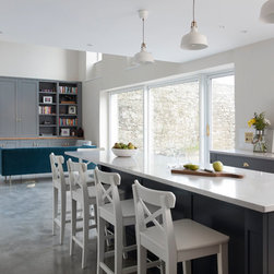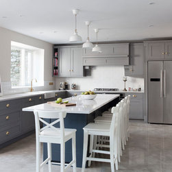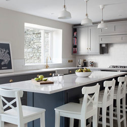 This beautiful Shaker style kitchen sits perfectly in this Georgian home renovation. Painted in Plumett and Templar Grey on the island finished with Victorian handles in polished brass and Lagoon Silestone