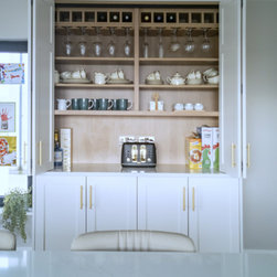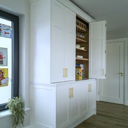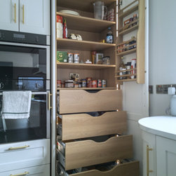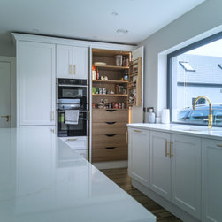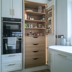 Functionality has been carefully woven throughout, supporting the rhythm of a busy home. The concealed bi-fold breakfast station streamlines morning routines, and the wall-run sink and hob leaves the island open to quickly deliver breakfast during early school mornings. The larder combines a pocket-door for ergonomic access and a swing-hinged with integrated spice racking for intuitive everyday use.