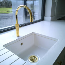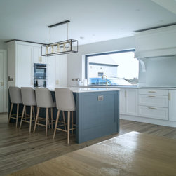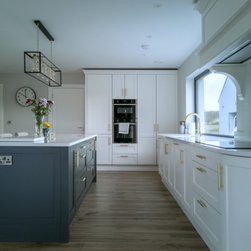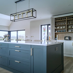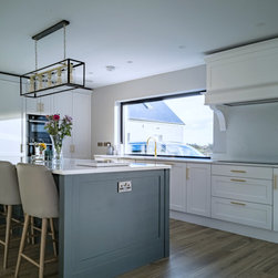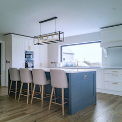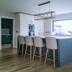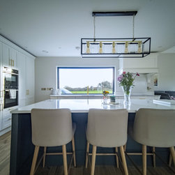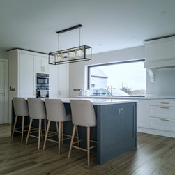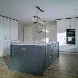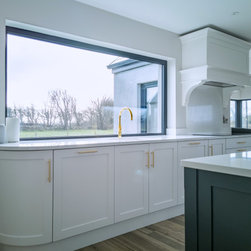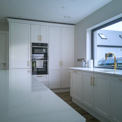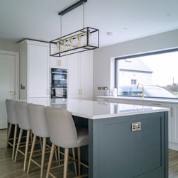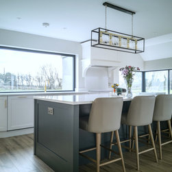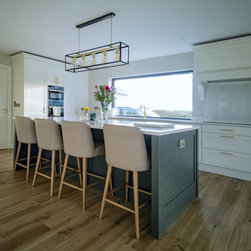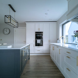 The design pairs shaker cabinetry in Whimbourne White for a crisp foundation with an island in Deep Forest Green for depth and contrast. The luminous veining of Calacatta Glow quartz sweeps across worktops, upstands, and the hob backsplash, complemented by gold hardware, electrical accents, and a matching Quooker tap for a modern, gently glamorous edge.