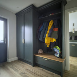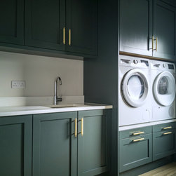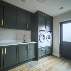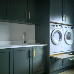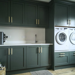 Beyond the kitchen, the Forest Green theme continues into a well-equipped utility and bootroom. The raised washer and dryer with pullout shelving simplify laundry tasks, with additional sink for handwashing built beside. Opposite, a coat rack, bench, and boot storage help keep the rest of the house clean and tidy.