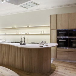 A handleless inspired white oak with an iconic sheeted panelled curved island.