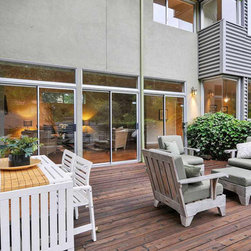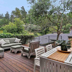 At that flat area, the main floor was placed along with a large deck with great access to the hillside (instead of being on stilts, as is common)